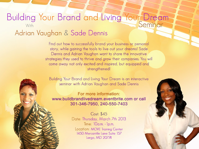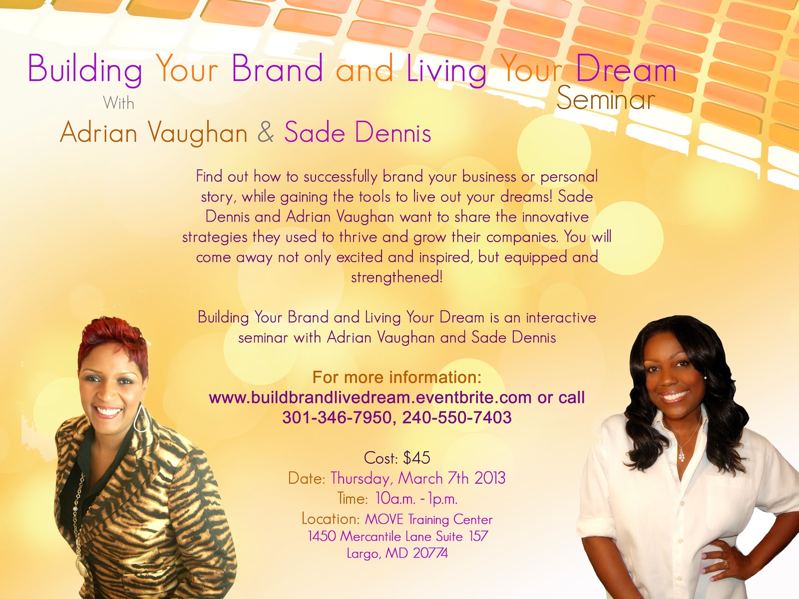 Whether you are a new or seasoned business owner, "Building Your Brand and Living Your Dream" Interactive Seminar is for you! Learn from Sade Dennis, Expert Branding Strategist and Adrian Vaughan author of “When opportunity Knocks” and owner of the M.O.V.E Training Center, how to successfully leverage your experience, natural talents, and current resources to live out your business dreams!